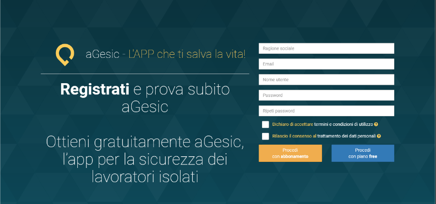 Per inziare a utilizzare aGesic, registrati ed effettua il primo accesso alla tua Dashboard amministrativa. Clicca sulla voce "Registrati", posizionata in alto a destra nella home del sito web.