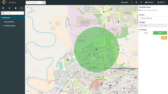 Che differenza c'è tra Zone Verdi e Zone Verdi Dinamiche? La Zone Verdi sono aree impostabili sulla mappa della Dashboard, contrassegnate come luoghi sicuri. In tali aree non è necessario usufruire della protezione di aGesic, quindi il sistema si mette in stand-by e l'invio degli allarmi per Stato di fermo viene sospeso. Le nuove Zone Verdi Dinamiche invece non contrassegnano luoghi specifici, ma si attivano quando il sistema rileva la presenza di due operatori in prossimità.